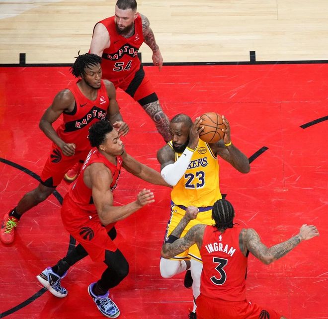 詹姆斯在41岁、第23个赛季,都被各种包夹和恶犯。有美国媒体NBA Memes就晒出詹姆斯在比赛中的画面,画面中詹姆斯被猛龙三个球员贴身包夹,配文:从未有过其他41岁老将受到如此高级别的防守待遇。类似的情况还有很多,比如詹姆斯上一次在多伦多对阵猛龙,被四个对手包夹。上赛季打黄蜂,詹姆斯也是被四个对手包夹。